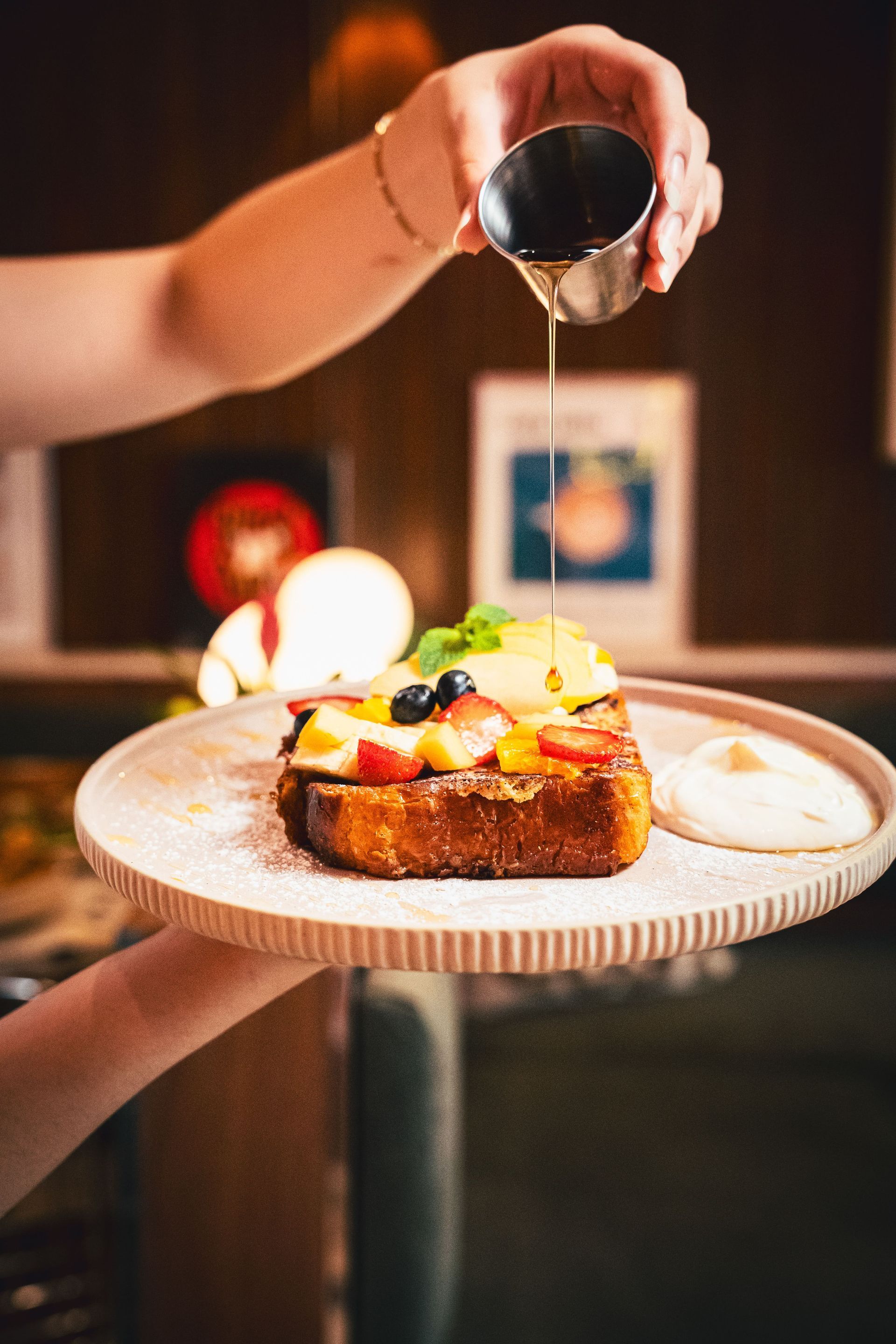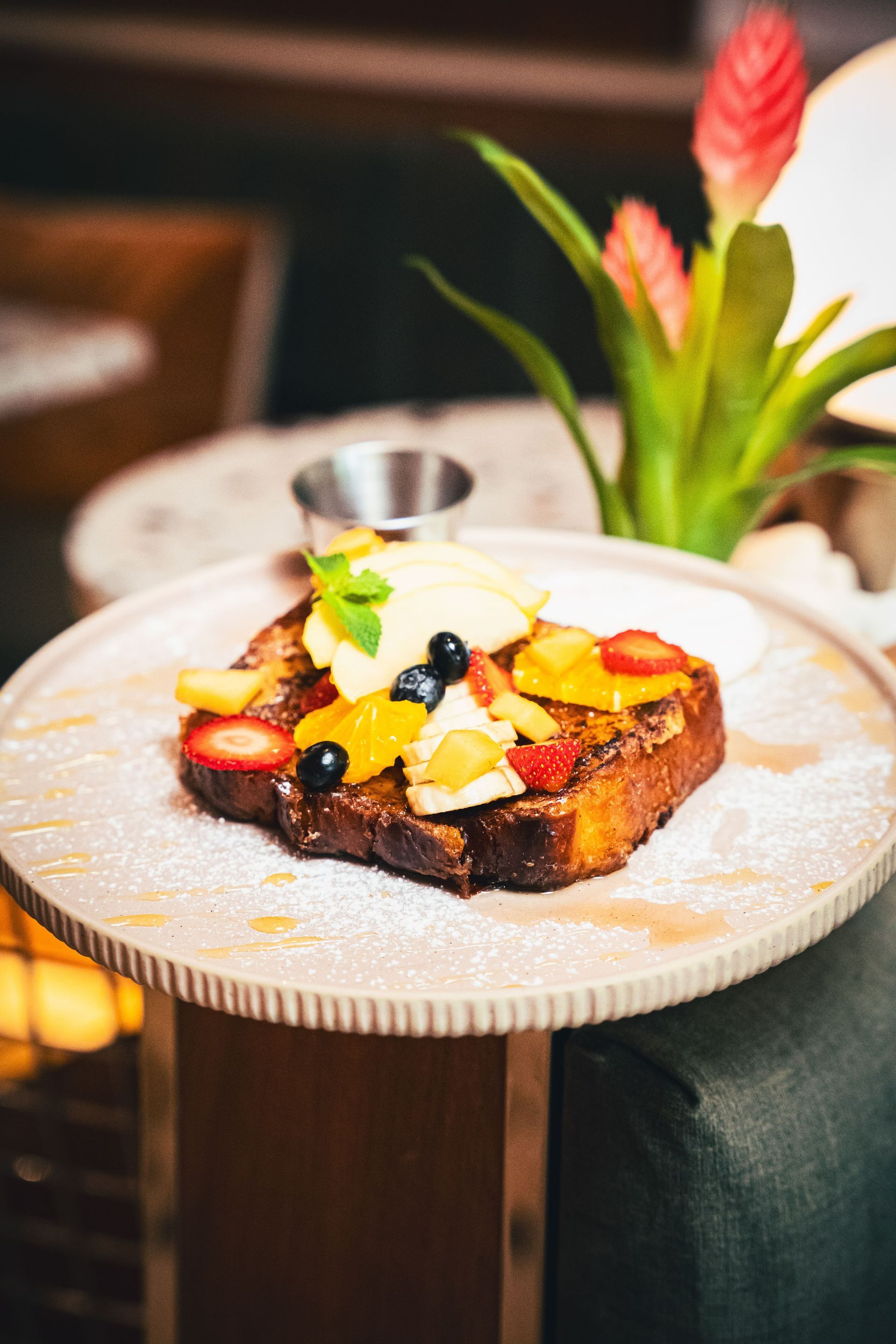 Généreuse tranche de brioche maison toastée, sirop d’érable, fruits frais, yaourt et sucre glace.