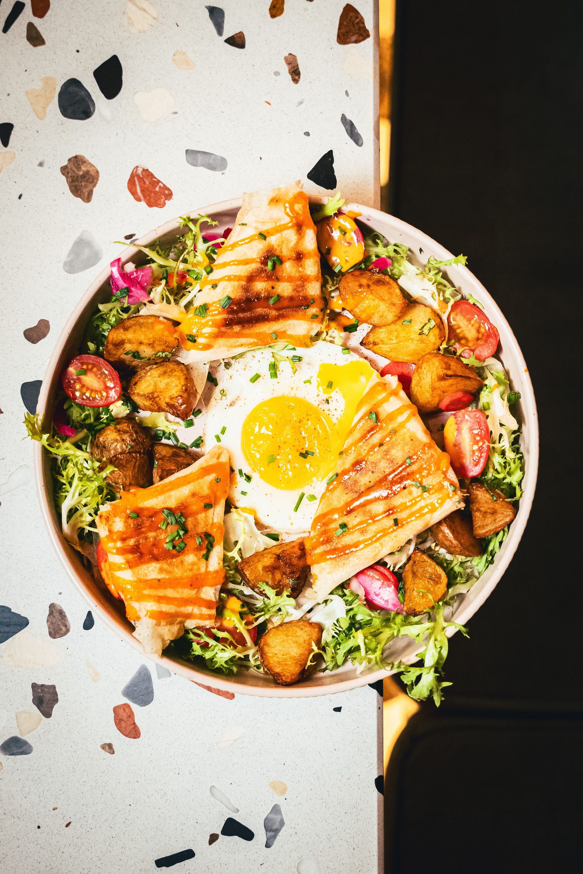 Poivrons, tomates, oignons, œuf au plat, féta, coriandre & pommes de terre sautées.
